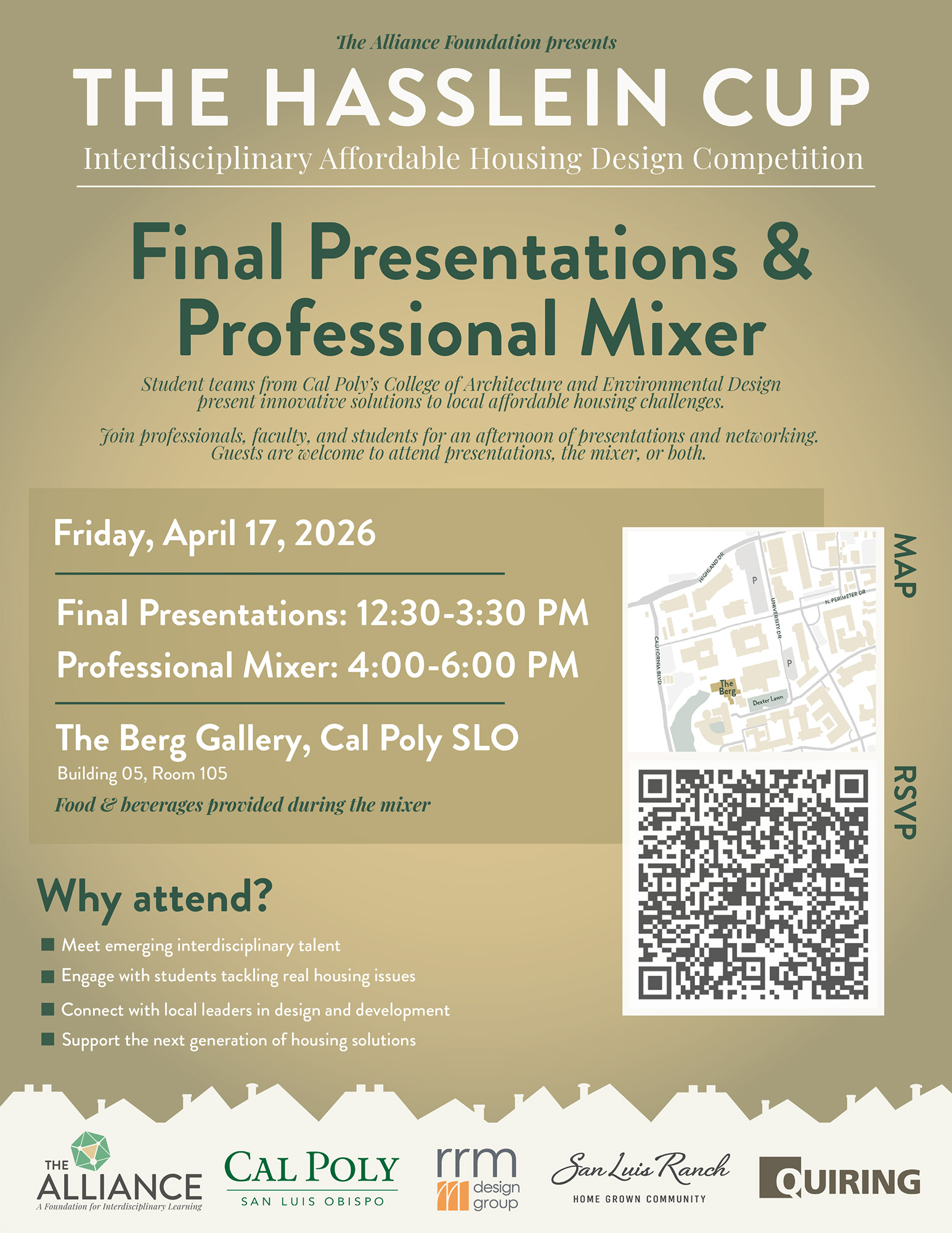 Student teams from Cal Poly’s College of Architecture and Environmental Design present innovative solutions to local affordable housing challenges. Join professionals, faculty, and students for an afternoon of presentations and networking.
