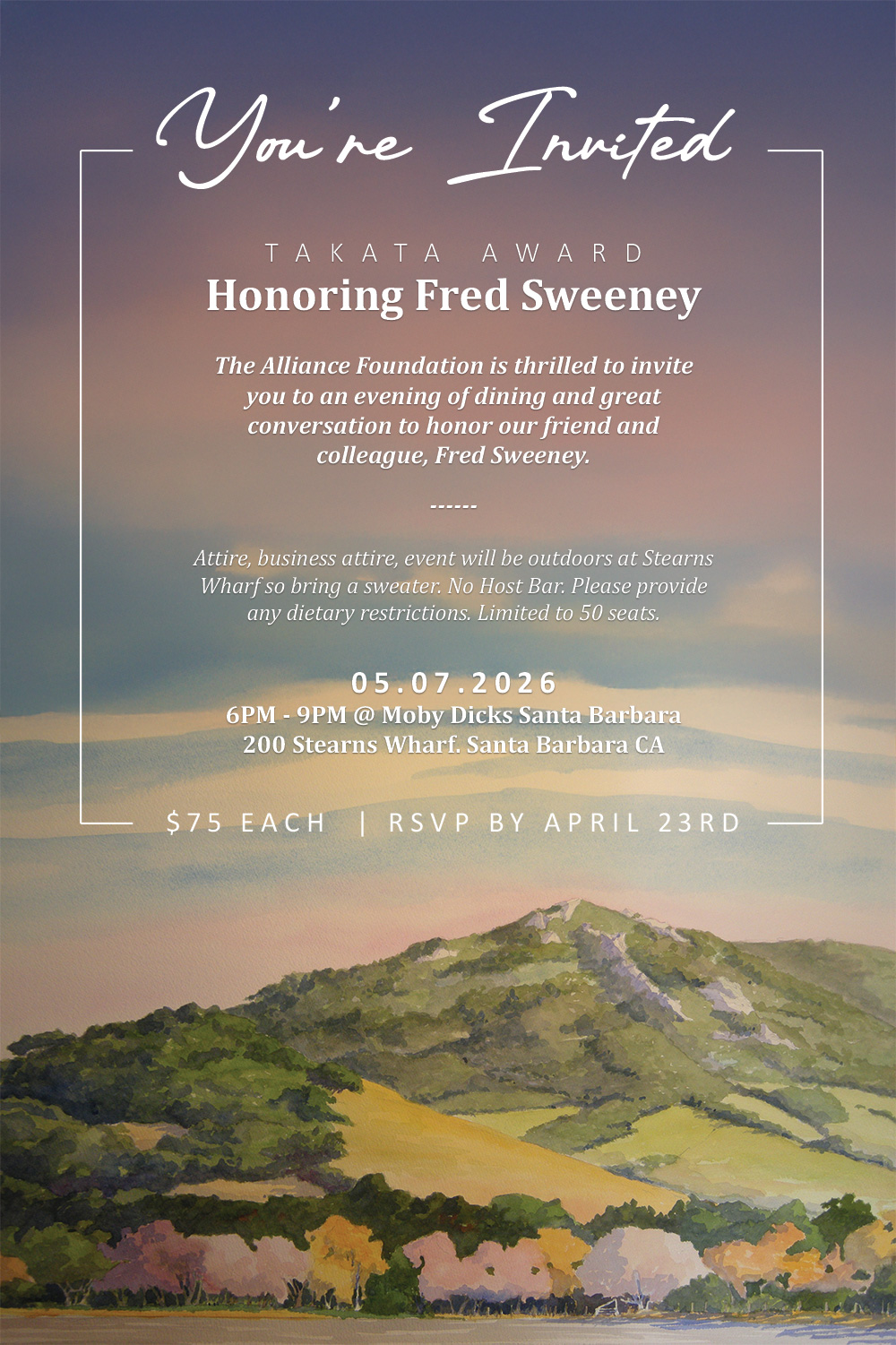 Attire, business attire, event will be outdoors at Stearns Wharf so bring a sweater. No Host Bar. Please provide any dietary restrictions. Limited to 50 seats.
